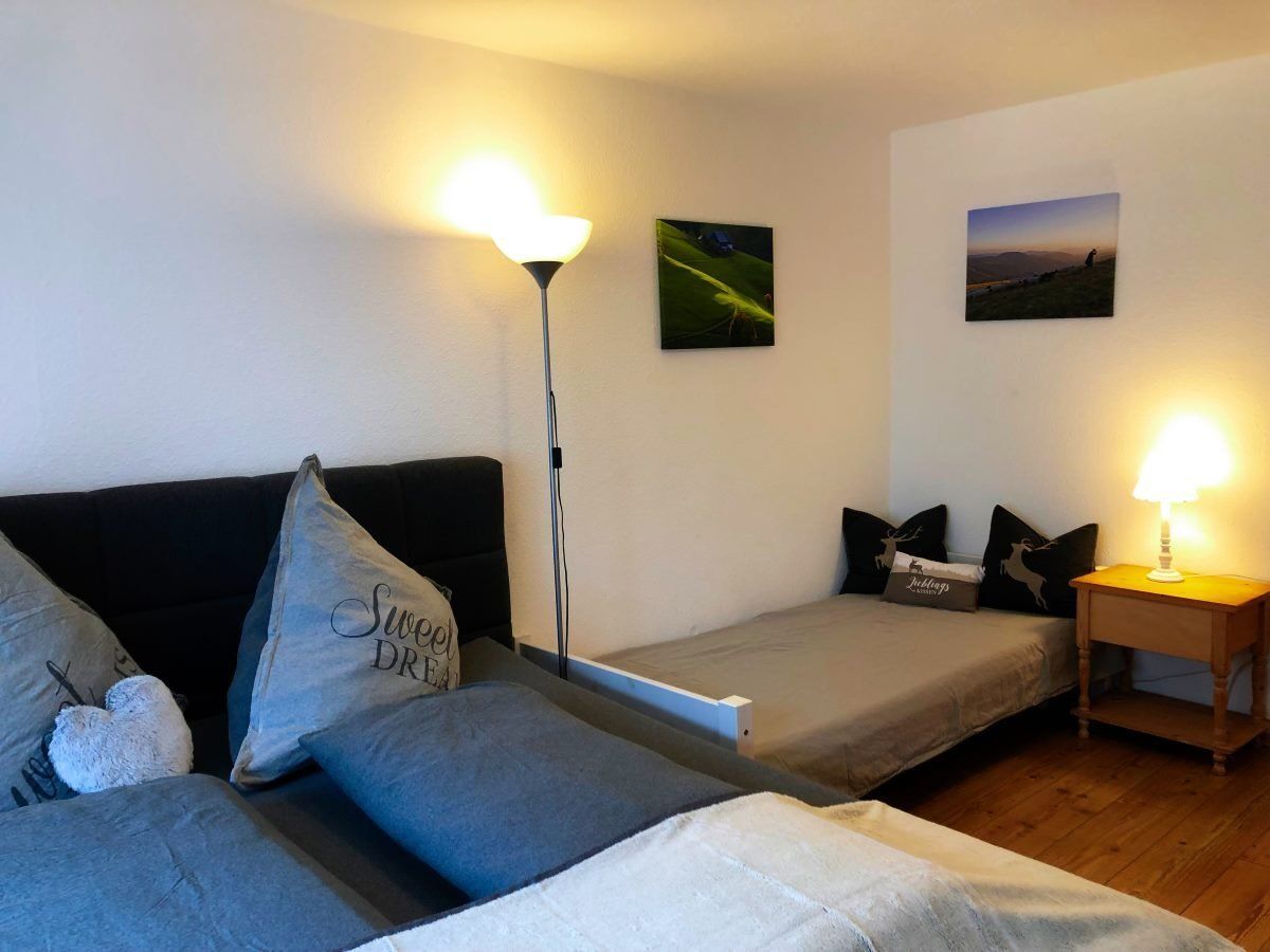 - Schlafzimmer 1: Doppel-Boxspringbett, Kleiderschrank, Nachtschränke und ein zusätzliches Einzelbett. Hier können 3 Personen gemütlich schlafen.